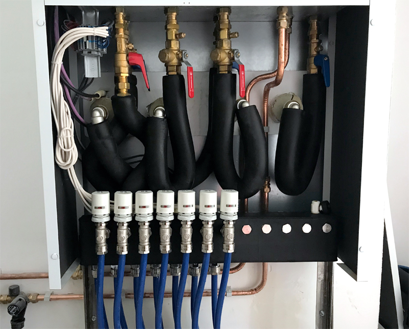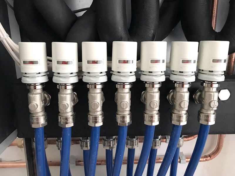 Vanaf de aan- & afsluitkranen stroomt water naar de vloerverwarming. De verbindingskabels leiden via de sensoren in de ruimtes naar de touchscreen bedienunit.