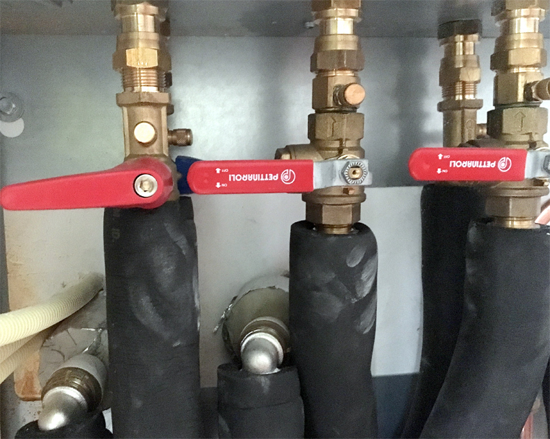 De aanvoer- en retourleidingen zijn aangesloten op de buiteninstallatie van het systeem. Rood staat voor aanvoer, blauw voor afvoer.